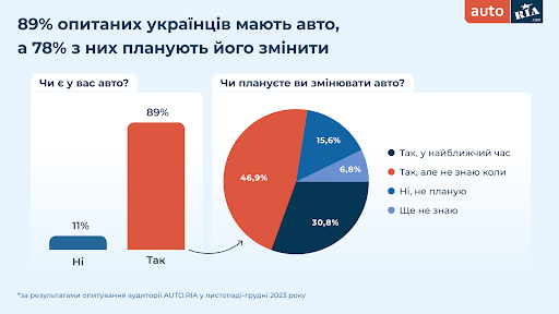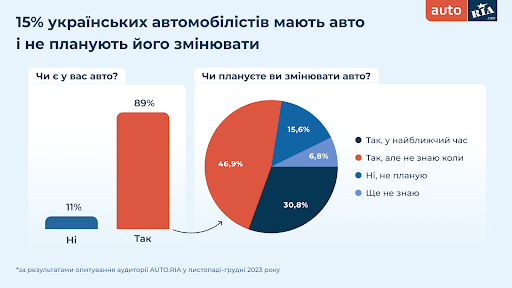 Експерти досліджували наміри придбати або замінити авто серед тих, хто ще немає транспорту та водіїв, які мають автомобіль. 89% українських автомобілістів мають авто та 78% з них планують його заміну. 31% хочуть це зробити найближчим часом, а 47% – поки не мають конкретних термінів для цього.