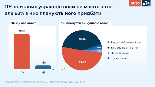 Український маркетплейс AUTO.RIA протягом листопада-грудня 2023 року проводив опитування своєї аудиторії. В дослідженні взяли участь 1200 українців. Мета опитування – дізнатися плани українців щодо купівлі авто або заміни наявного у 2024 році чи у найближчий період. Експерти AUTO.RIA проводили збір інформації на маркетплейсі за допомогою форми опитування.