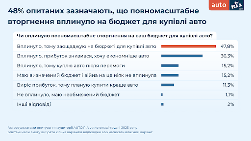 11% людей зазначили, що мають визначений бюджет для купівлі авто і повномасштабне вторгнення на нього не вплинуло. Проте 48% покупців заощаджують на купівлі. 36% опитаних указали, що прибуток зменшився, тому хочуть економнішу автівку.